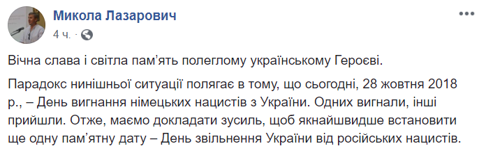 Парадокс нынешней ситуации заключается в том, что сегодня, 28 октября 2018 - День изгнания немецких нацистов из Украины. Одних выгнали, другие пришли. Итак, должны прилагать усилия, чтобы как можно быстрее установить еще одну памятную дату - День освобождения Украины от российских нацистов".