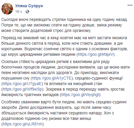 И.о. министра здравоохранения Ульяна Супрун рассказала, что перевод часов на зимнее время может вызвать дополнительный стресс для организма. Об этом она сообщила в Facebook.