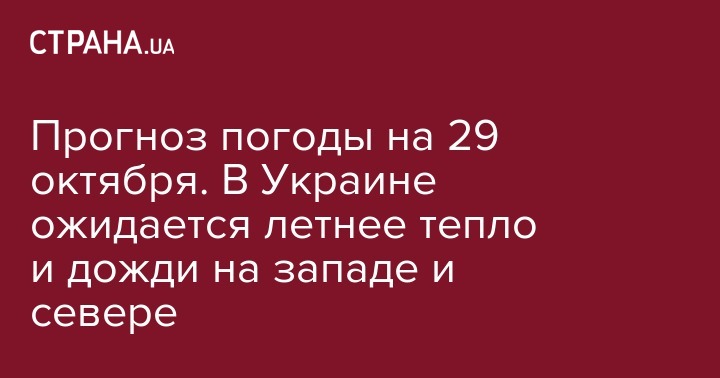 В понедельник, 29 октября на территории Украины обещают преимущественно солнечную погоду без осадков, дожди возможны только в западной части страны и на севере. Воздух прогреется до +18...+20 градусов, а в некоторых регионах - до +22. Об этом сообщается на сайте Укргидрометцентра