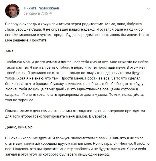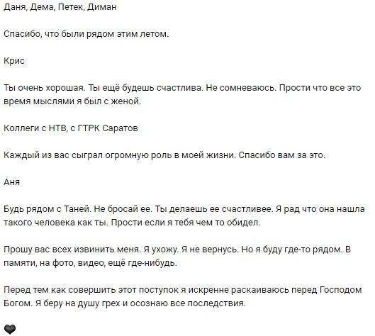 На своей странице в соцсети "Вконтакте" он оставил сообщение с извинениями перед родителями, бывшей женой, друзьями и коллегами. Из текста его прощального письма становится понятно, что журналист тяжело переживал развод с женой.