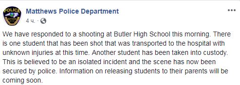 В американском штате Северная Каролина в школе в городе Мэттьюз произошла стрельба, в результате которой пострадал один ученик. Об этом сообщает местный департамент полиции на странице в Facebook.