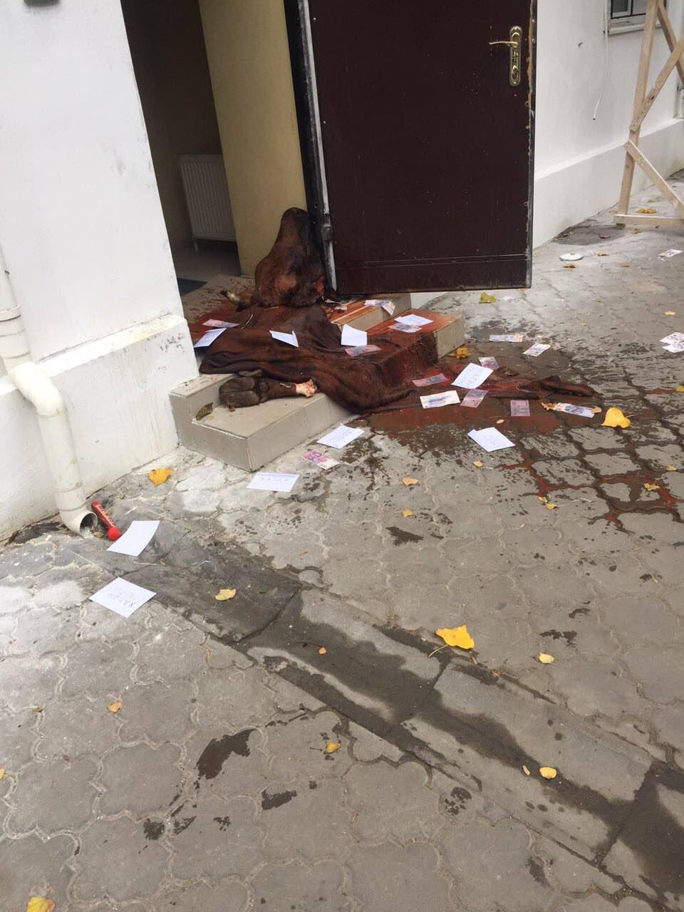 По его словам, неизвестные в масках забросали вход в здание дымовыми шашками, а также головой, шкурой и копытами мертвой коровы. К этому они добавили сувенирные купюры.