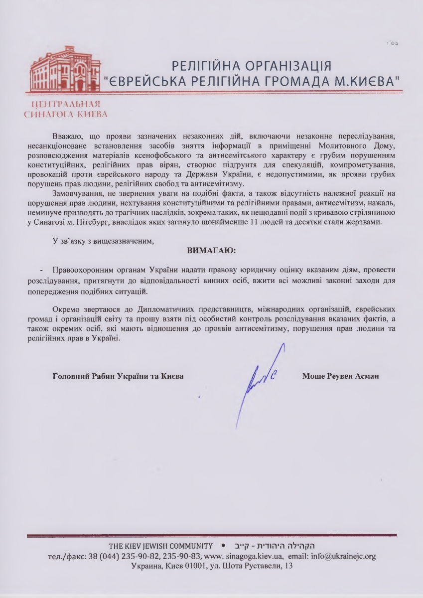 В нем речь идет о том, что в октябре 2018 года служба безопасности Еврейской общины Киева обнаружила лиц, которые профессионально следили за помещением центральной Синагоги в Киеве, которая располагается по адресу улица Шота Руставелли, 13, и за ее прихожанами.