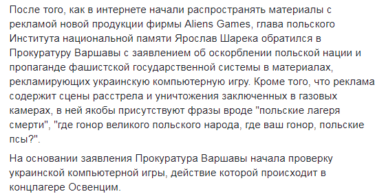 Украинская фирма Aliens Games анонсировала компьютерную игру, основанную на массовых убийствах людей в немецком лагере смерти Освенцим (Auschwitz-Birkenau). На данную компанию уже открыли уголовное дело в Польше.