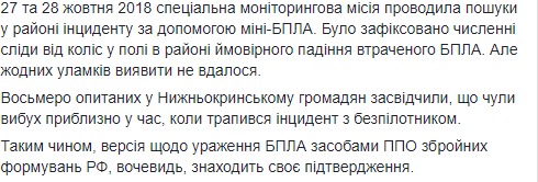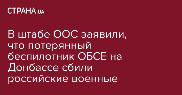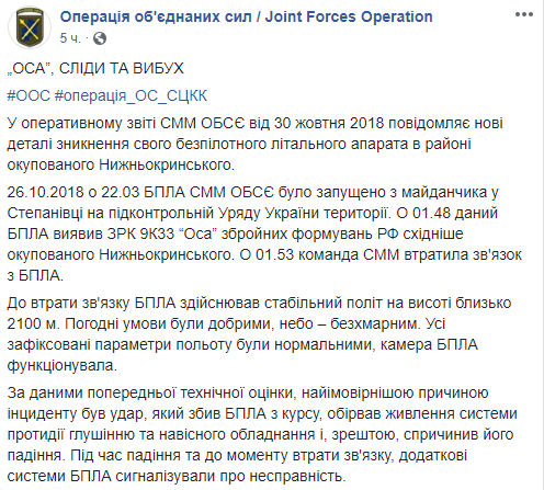 Штаб операции Объединенных сил заявляет, что потерянный 27 октября в Донецкой области беспилотный летательный аппарат СММ ОБСЕ, который наблюдал за колонной грузовиков из России, был сбит войсками противовоздушной обороны России. Об этом сообщает пресс-центр ООС в Facebook.