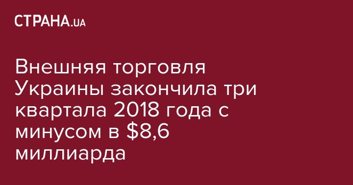 Баланс внешней торговли товарами и услугами Украины за январь-сентябрь 2018 года сведен с дефицитом на уровне 8,598 миллиарда долларов, что в 1,5 раза выше дефицита за аналогичный период 2017 года в размере 5,794 миллиарда долларов.