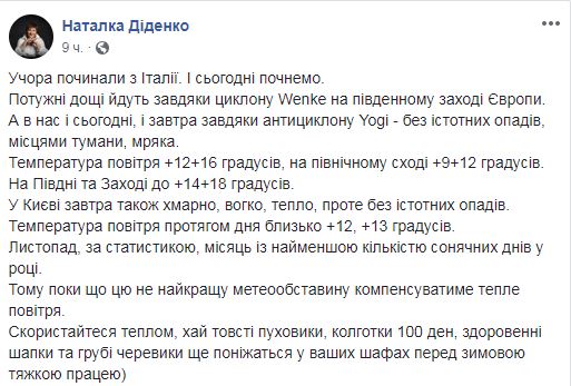 "Ноябрь, по статистике, месяц с наименьшим количеством солнечных дней в году. Поэтому пока эту не лучшую метеообстановку будет компенсировать теплый воздух. Воспользуйтесь теплом, пусть толстые пуховики, колготки 100 den, здоровенные шапки и грубые ботинки еще понежатся в ваших шкафах перед зимней тяжким трудом)", - подытожила Диденко.