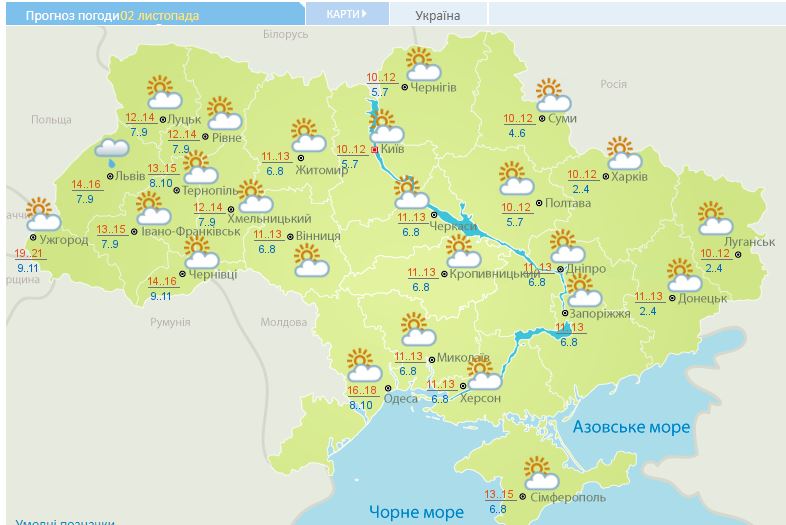 Сегодня, 2 ноября, почти во всех областях Украины ожидается сухая и облачная погода. Об этом пишет сайт Укргидрометцентра.