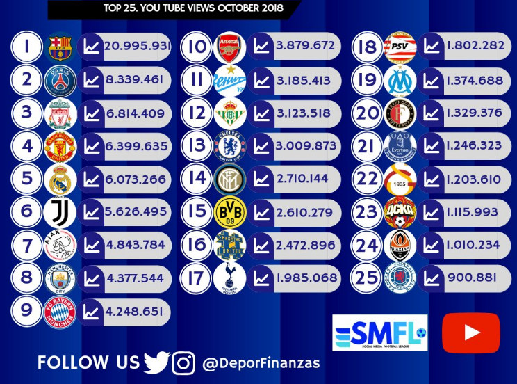 Лидером видеорейтинга стала "Барселона" с результатом 20,9 млн. просмотров. На втором месте парижский "ПСЖ" - 8,3 млн. Замыкает тройку лидеров среди Youtube-каналов "Ливерпуль". Англичан насмотрели на 6,8 млн просмотров.