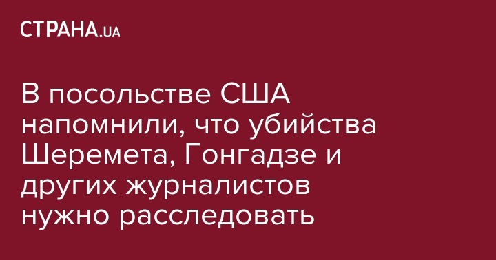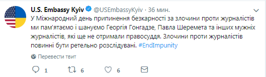 В Международный день прекращения безнаказанности за преступления против журналистов посольство США в Украине призвало власть тщательно расследовать подобные прецеденты. Об этом идет речь в обращении посольства в Twitter.