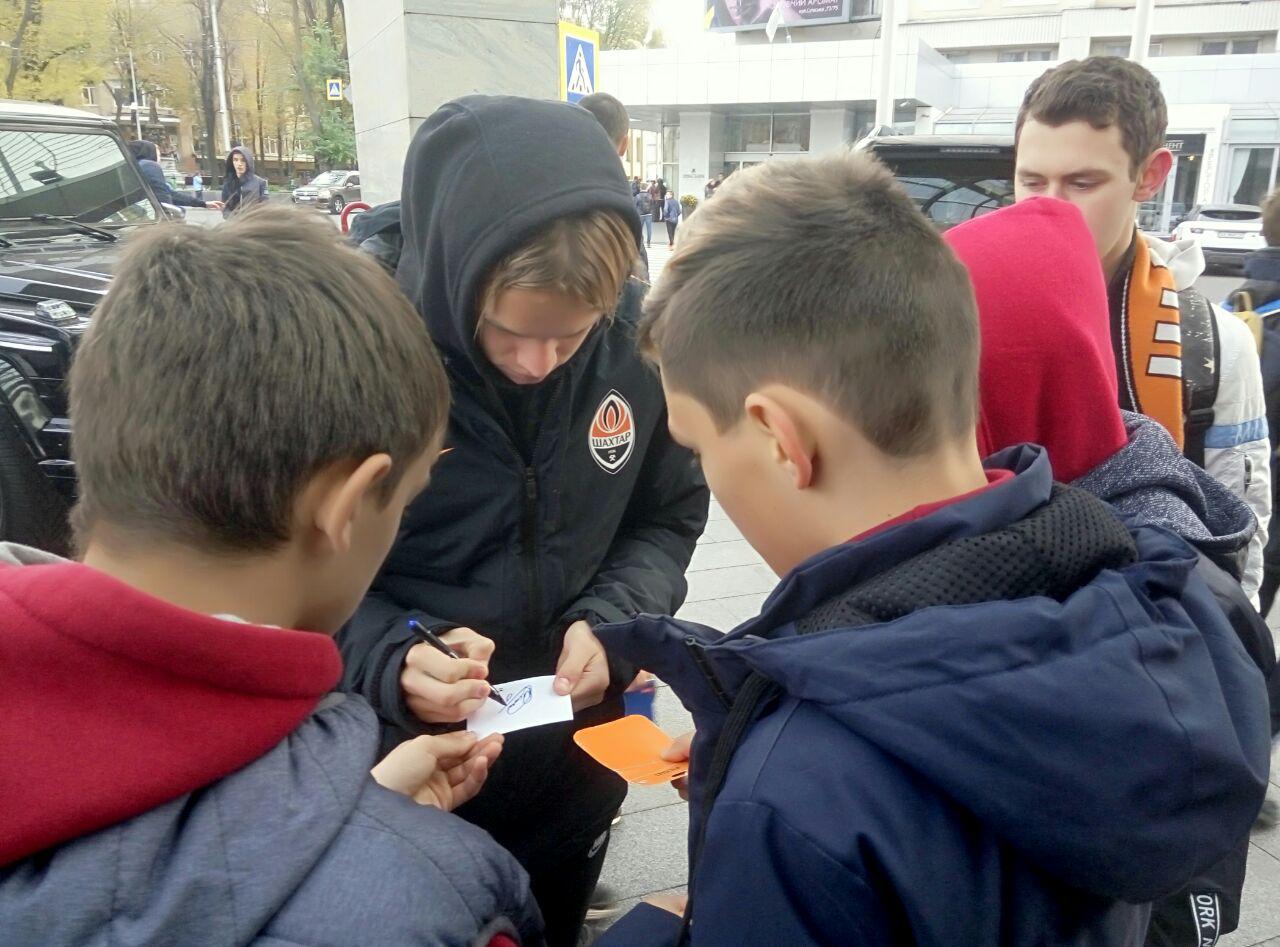 У гостиницы "Kharkiv Palace" сегодня днем собрались болельщики Шахтера. Они пришли не зря. Михаил Мудрик с удовольствием фотографировался со всеми желающими.