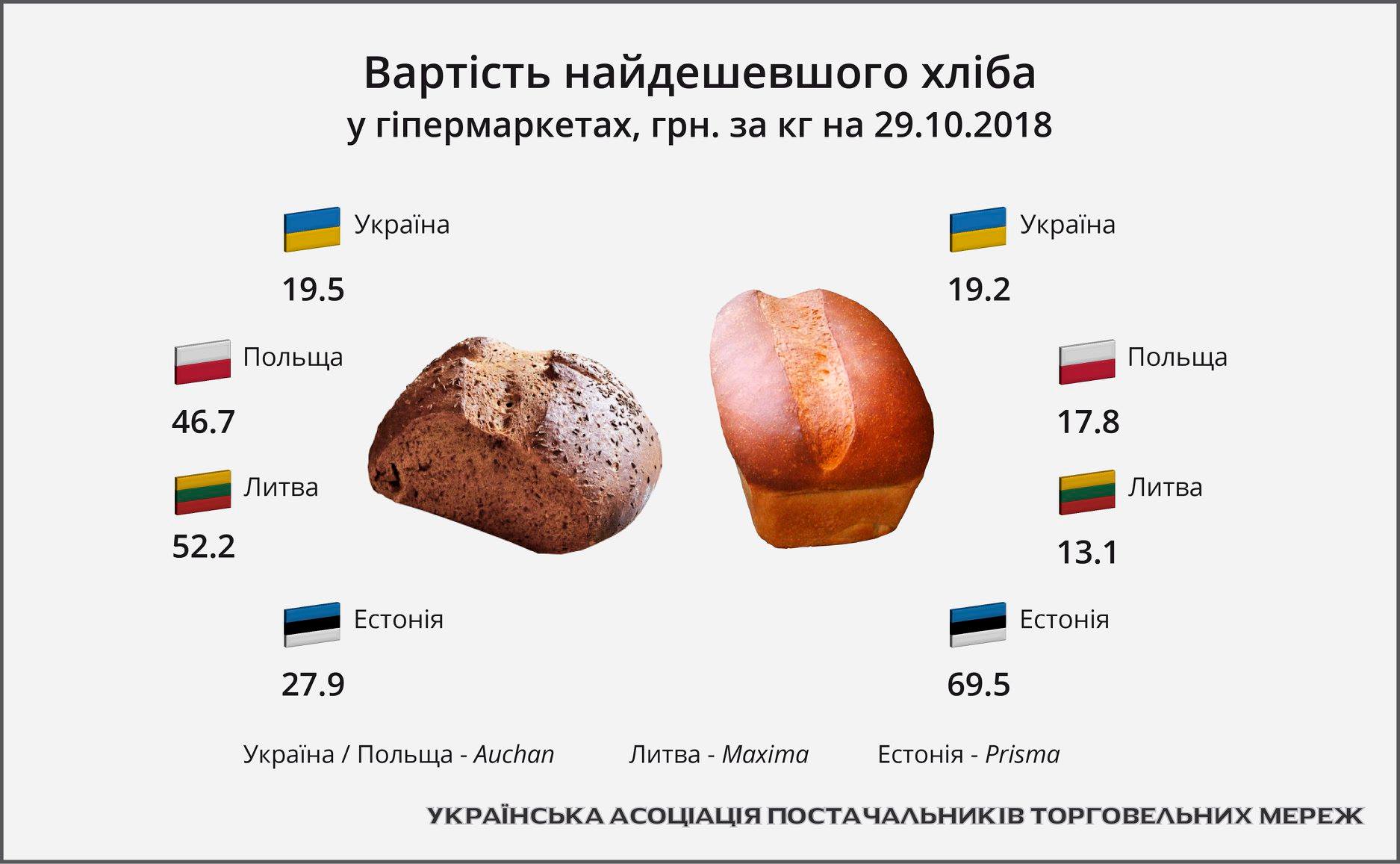 "В нашей стране уже не самый дешевый хлеб в Европе. В Литве можно приобрести самый дешевый килограмм белого хлеба за 13,1 грн, Польше - по 17,8 грн и Украине - по 19,2 грн. В Эстонии его можно найти по 69,5 грн. При этом вероятно, что хлеб в этих странах мог быть испеченным с украинского зерна. Украинские хлебопеки часто говорят, что производить дешевый социальный хлеб невыгодно. Но пример соседних стран показывает, что это может быть выгодно даже в Европе", – отметил Дорошенко.