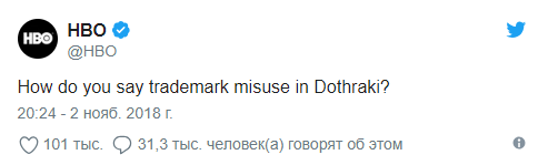 "Нам не было известно об этом сообщении, и мы бы предпочли, чтобы наш товарный знак не присваивали бы в политических целях", - говорится в комментарии телеканала. Кроме того, в твиттер HBO появилась запись: "Как бы вы сказали "неправомерное использование товарного знака" на дотракийском?" (Дотракийский - вымышленный язык, используемый в сериале, - Прим.Ред).