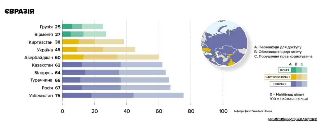 Рейтинг Украины авторы отчета оценили в 45 баллов. За 7 лет в стране ухудшились показатели от "свободной" до "частично свободной".