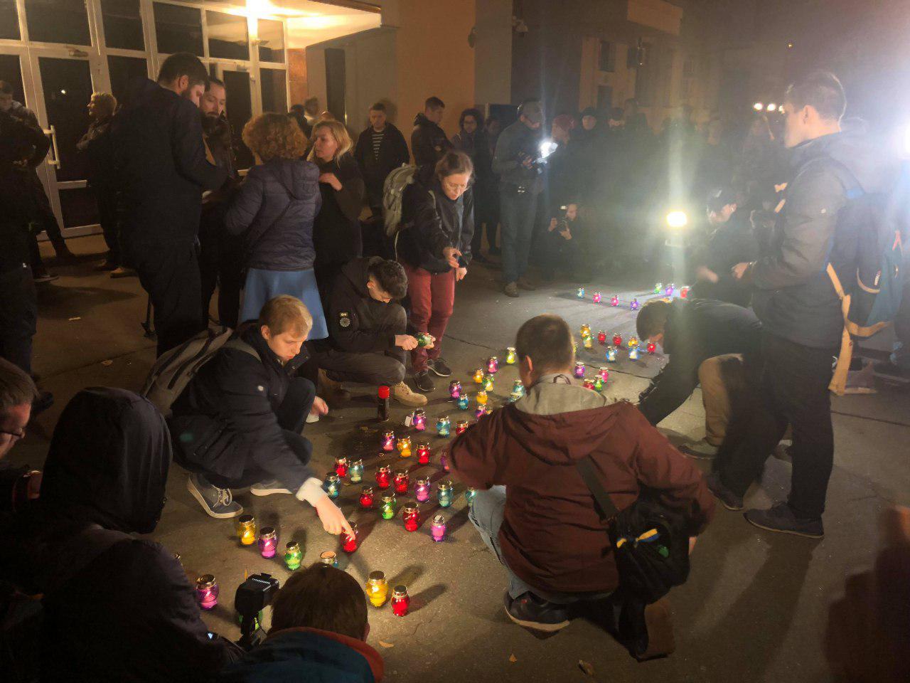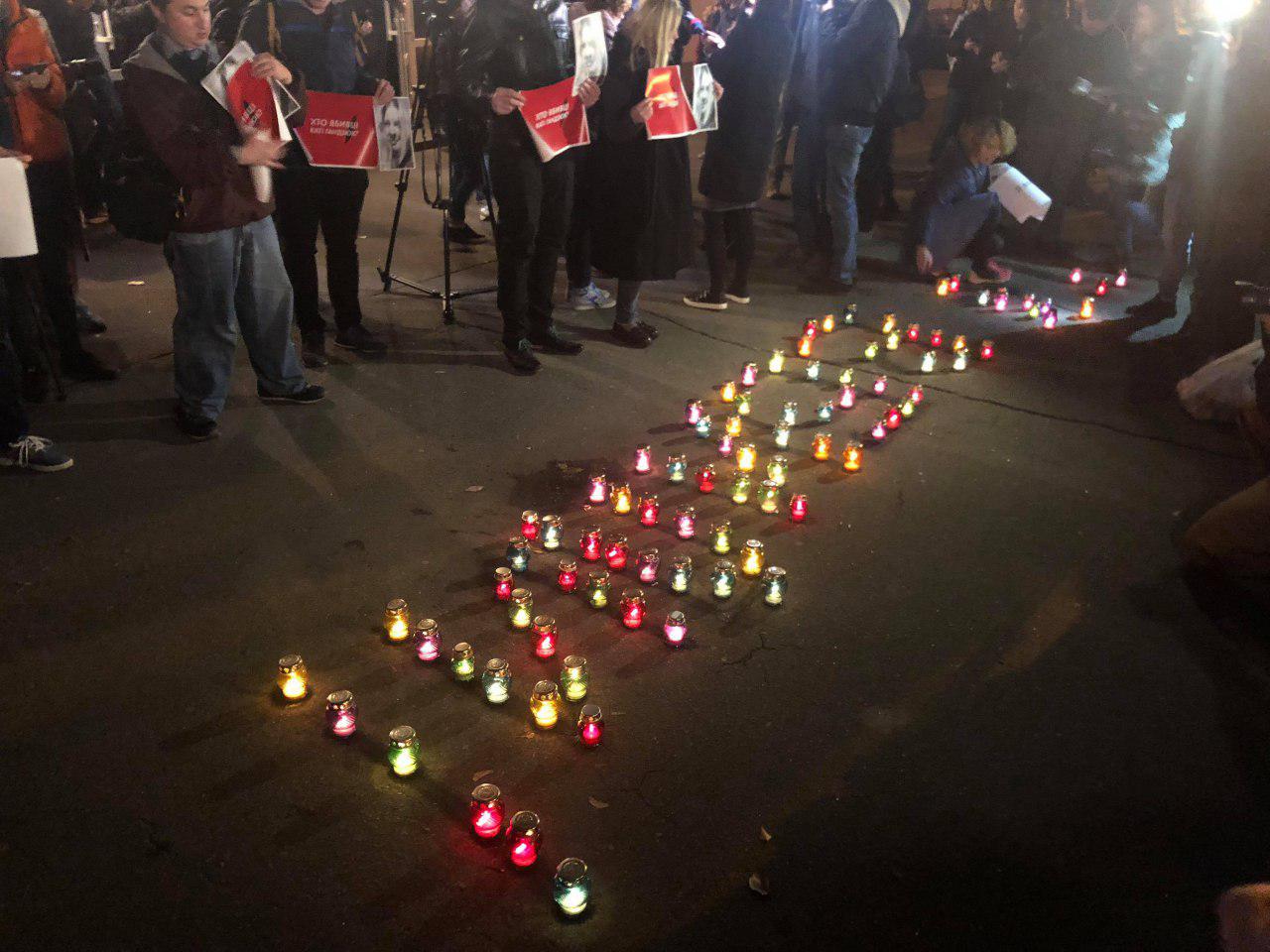 Как сообщил корреспондент "Страны", под МВД сейчас находятся около трех сотен человек, четверть из которых - журналисты. Они выложили из свечей слова "Її вбили".