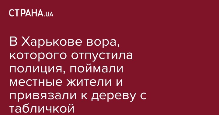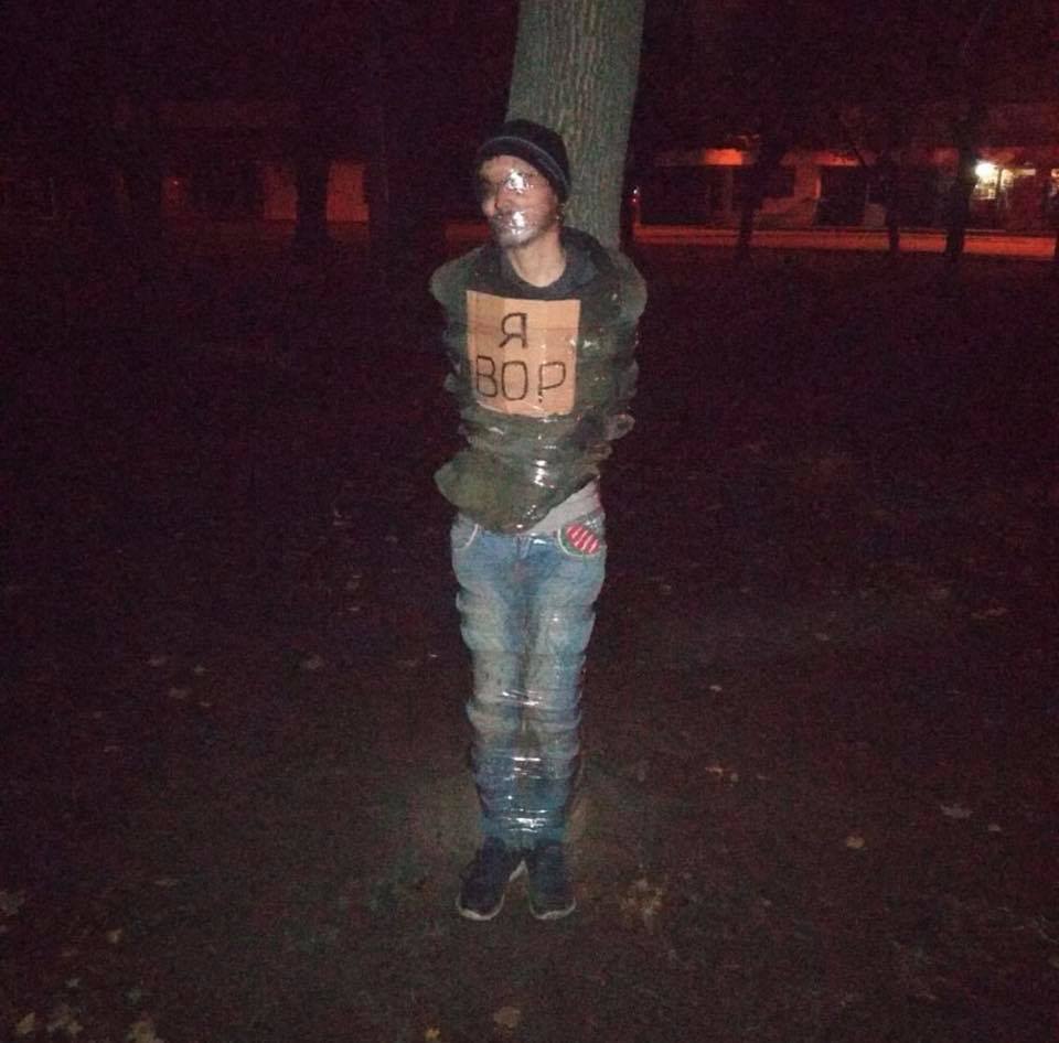В Харькове вора, которого выпустили из райотдела, привязали к дереву скотчем и приложили соответствующую табличку. Об этом пишет паблик "Харьков 1654" в социальной сети Facebook.