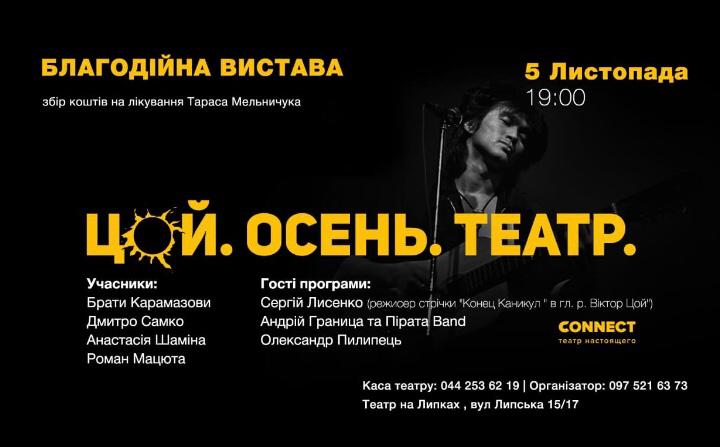 Сегодня, 5 ноября, в Киеве Театр на Липках представит благотворительный спектакль "Цой. Осень. Театр". На сцену перед публикой выйдут "Братья Карамазовы", Дмитрий Самко, Роман Мацюта, Серго Чантурия и Андрей Граница из культовой рок-группы "Пираты Бэнд" а также и молодые актеры.