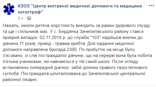 В пятницу, 2 ноября, очередной случай школьного насилия (буллинга) произошел в селе Бердянка Зачепиловского района Харьковской области. В местной школе подростки избили 11-летнюю ученицу. После избиения в учебное заведение вызвали врачей, девочку госпитализировали.