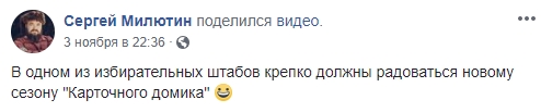 Журналист Сергей Милютин пишет с намеком на Тимошенко: " В одном из избирательных штабов крепко должны радоваться новому сезону "Карточного домика".