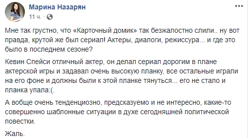 Пользователь Марина Назарян считает, что сериал без Спейси проиграл: "Мне так грустно, что "Карточный домик" так безжалостно слили.. ну вот правда, крутой же был сериал! Актеры, диалоги, режиссура... и где это было в последнем сезоне?