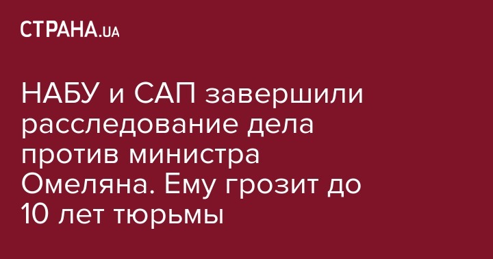 Национальное антикоррупционное бюро (НАБУ) и Специализированная антикоррупционная прокуратура (САП) завершили расследование уголовного производства против министра инфраструктуры Владимира Омеляна по подозрению в незаконном обогащении и декларировании недостоверной информации. Чиновнику грозит от 5 до 10 лет лишения свободы с конфискацией имущества.
