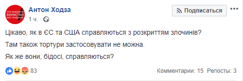 "Интересно, как в ЕС и США справляются с раскрытием преступлений? Там также пытки использовать нельзя. Как же они, бедоси, справляются?", - пишет Ходза.