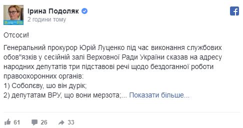 После этого на вопрос от нардепов, на каком основании Луценко позволяет себе неуважительное отношение к депутату, генпрокурор ответил: "Все это уже было в прошлом году, когда мерзавцы пытались примазаться к убийству Ноздровской и проливали здесь море лживых слез о том, что следствие ничего не делает. Когда обвиняемый в убийстве пошел в суд, ни один из этих мерзавцев не пошел даже в суд. Никого это не волнует! И сегодня похоронами Гандзюк занимается "Народный фронт", а не эти деятели, которые собирают на этом свои кровавые дивиденды. А если бывший председатель комитета, который должен был руководить всей антикоррупционной политикой, до сих пор не понимает разницу между процессуальным руководством и следствием, которого в ГПУ уже нет год, то это не председатель комитета, а просто недоросль, у которого диарея мозга выливается здесь, прямо в зале". Тут Луценко, очевидно, имел ввиду Егора Соболева, который до недавнего времени возглавлял антикоррупционный комитет Рады.