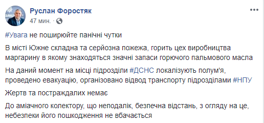 "В городе Южный сложный и серьезный пожар, горит цех производства маргарина, в котором находятся значительные запасы горючего пальмового масла… проведена эвакуация, организован отвод транспорта", – написал он на своей странице в Facebook во вторник вечером.