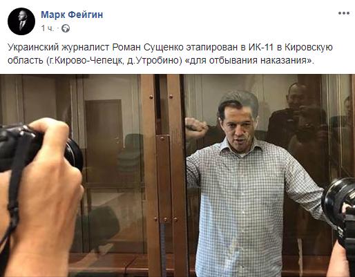 "Украинский журналист Роман Сущенко этапирован в ИК-11 в Кировскую область (г.Кирово-Чепецк, д.Утробино) «для отбывания наказания»", - написал Фейгин.