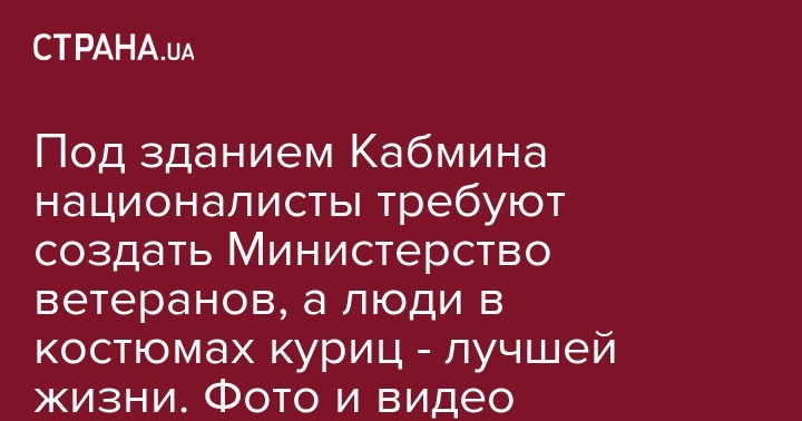 Под стенами здания Кабмина около 300 человек требуют от правительства не затягивать в политических целях создание этого министерства. Среди них -  члены Единого союза патриотов Украины, Национальных дружин, Национального корпуса и Ветеранского братства, бойцы батальона "Айдар", ветераны АТО. По их мнению, Министерство ветеранов должно полностью обеспечивать социальную защиту тех украинцев, которые принимали участие в боевых действиях, в том числе, на востоке страны. Активисты утверждают, что существующие общественные структуры и организации, занятые в данной сфере, коррумпированы и слишком погрязли в бюрократии.