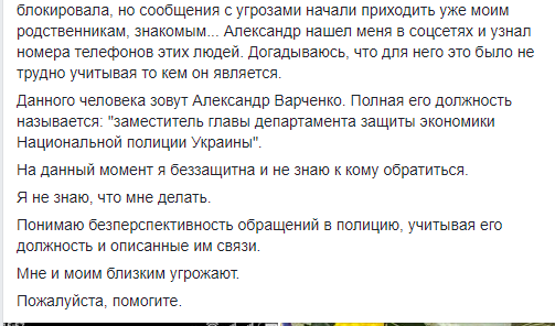 Студентка Наталья Бурейко пожаловалась в соцсети, что заместитель департамента защиты экономики Национальной полиции Украины Александр Варченко приставал к ней, а после отказа угрожал девушке. Пост об этом Наталья разместила в Facebook.