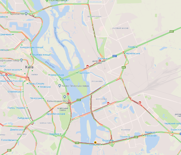 Утром 8 ноября в Киеве образовались огромные пробки. Основные заторы наблюдаются на мостах через Днепр, а также в центре столицы. Об этом свидетельствуют данные на Google Maps.