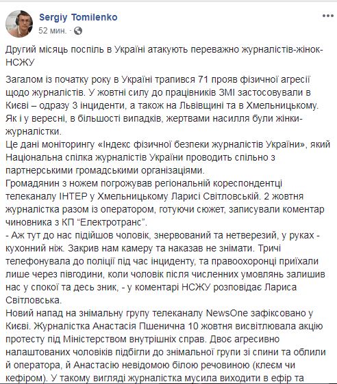 Он отмечает, что по данным мониторинга "Индекс физической безопасности журналистов Украины", с начала года в Украине произошел 71 случай проявления физической агрессии в отношении сотрудников СМИ. "В октябре силу к работникам СМИ применяли в Киеве - сразу 3 инцидента, также произошло по одному случаю в области и в Хмельницком. Как и в сентябре, жертвами насилия в основном были женщины-журналистки, которые в октябре пострадали в четырех из пяти случаев", - отмечает Томиленко.