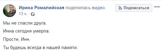 Свой последний пост в Facebook Инна Жмуд написала 6 ноября: "Сегодня я поняла одну вещь. Иногда лучше чего-то просто не знать. Чтобы не накручивать себя. Чтобы не реветь. Чтобы не думать о плохом. Просто не знать. Потому что это так тяжело... И так. Ты - сильная, мужественная, бла-бла... но...".