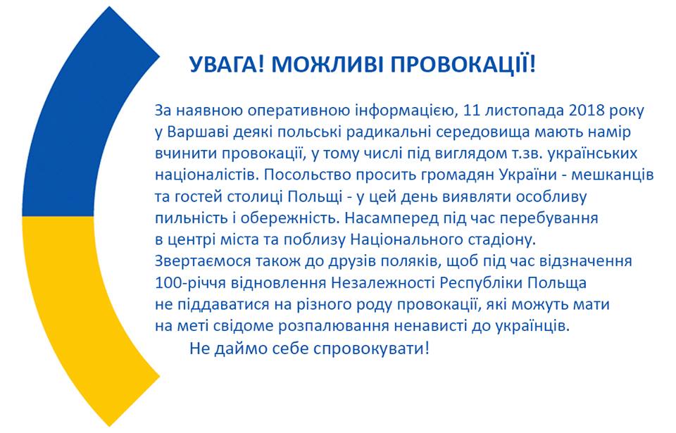 По данным посольства, провокации могут произойти в Варшаве 11 ноября, во время празднования 100-летия восстановления Независимости Польши. Местные радикалы намерены проводить компрометирующие акции, прикидываясь при этом украинскими националистами.