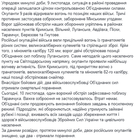 10 ноября зафиксирован один обстрел вблизи Тарамчука. Тяжелое вооружение не применялось. Потерь нет.