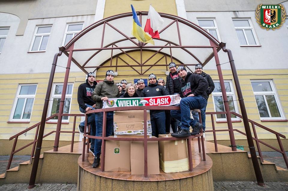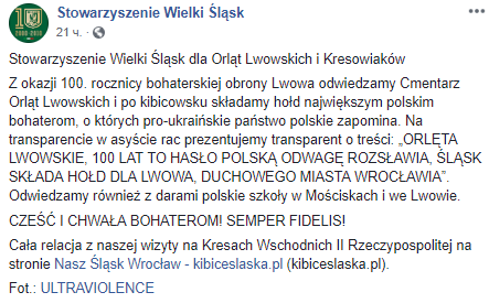 На фото видно, что около 10 мужчин на кладбище орлят развернули большой бело-красный транспарант с текстом "Орлята львовские, 100 лет - это лозунг польскую отвагу прославляет. Силезия отдает дань Львову, духовному городу Вроцлава". При этом фанаты зажгли более десяти файеров.