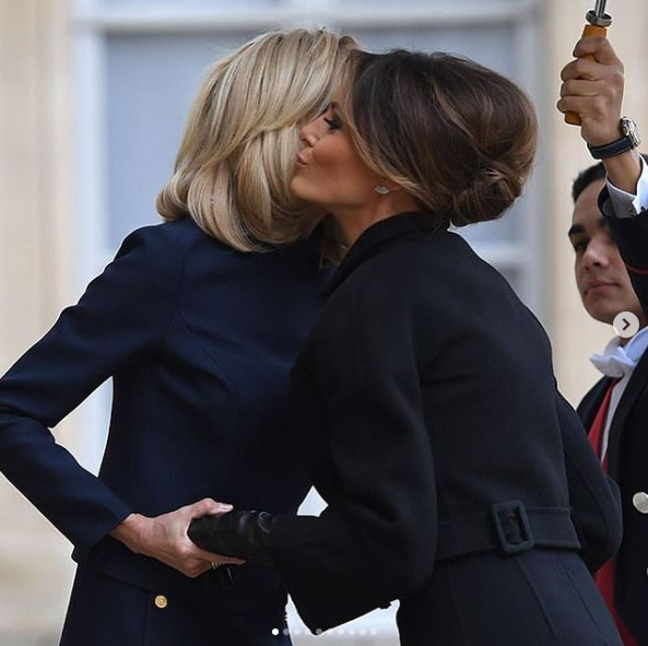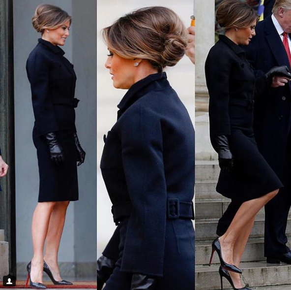 Так, Мелания надела утонченное осеннее пальто от Bottega Veneta с ремешком на поясе и широкими рукавами. К нему Мелания подобрала кожаные перчатки. Отметим, что во время визита во Францию Мелания отказалась от традиционной укладки волос. Зато она продемонстрировала элегантную прическу.