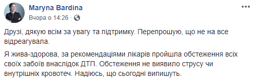"Друзья, спасибо всем за внимание и поддержку ... Я жива-здорова, по рекомендациям врачей прошла обследование всех своих забоев в результате ДТП. Обследование НЕ выявило сотрясения или внутренних кровотечений. Надеюсь, что сегодня выпишут", - написала она.