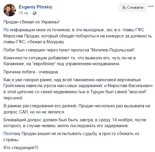 Бывший глава государственной фискальной службы Украины (ГФС) Мирослав Продан выехал из Украины на территорию Молдовы. Об этом в своем Facebook сообщил журналист Евгений Плинский.