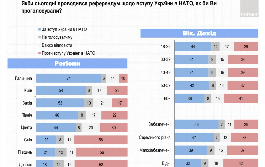 В исследовании речь идет о том, что количество сторонников вступления в НАТО больше среди жителей центрально-западных регионов, более младших и состоятельных респондентов.