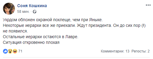 "Укрдом обложен охраной похлеще, чем при Яныке. Некоторые иерархи все же приехали. Ждут президента. Он до сих пор (!) не появился. Остальные иерархи остаются в Лавре.