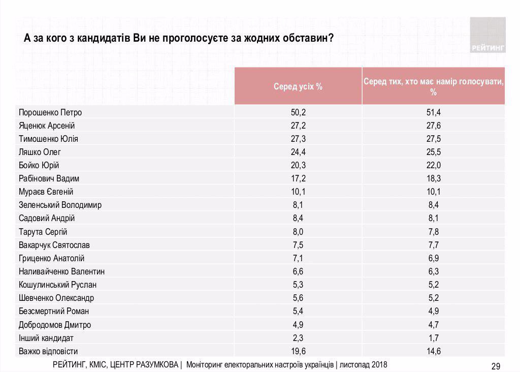 Петр Порошенко в ноябре возглавил антирейтинг кандидатов в президенты - за него ни в коем случае не проголосовали бы 50% избирателей. А во втором туре действующий глава государства проигрывает практически любому кандидату.