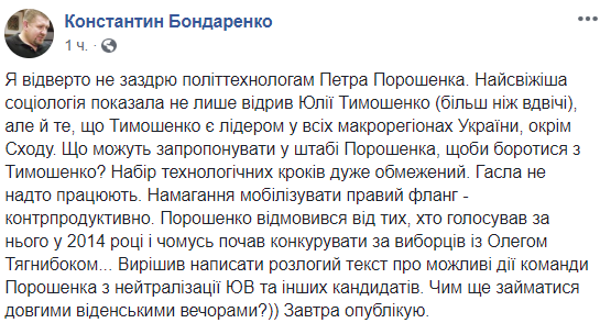 "Я откровенно не завидую политтехнологам Петра Порошенко. Самая свежая социология показала не только отрыв Юлии Тимошенко (более чем в два раза), но и то, что Тимошенко является лидером во всех макрорегионах Украины, кроме Востока", - пишет политолог Константин Бондаренко.