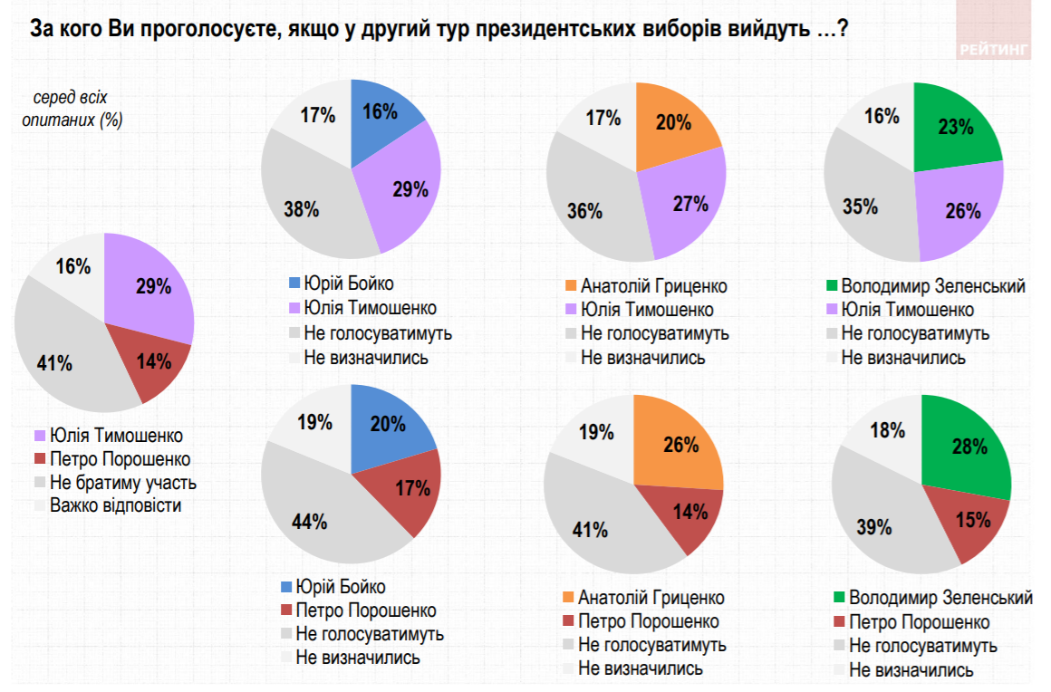 Впрочем, если даже Порошенко прорывается во второй тур, то всем потенциальным конкурентам с сопоставимым рейтингом он проигрывает - Тимошенко, Гриценко, Зеленскому и Бойко.