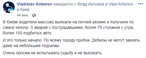 Основатель dtp.kiev.ua Влад Антонов сообщил, что утром в Киеве были зафиксированы 5 аварий с пострадавшими, более 70 столкновений авто, более 150 подбитых машин.
