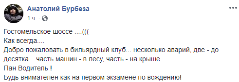 "Гостомельское шоссе ....((( Как всегда.... Добро пожаловать в бильярдный клуб... несколько аварий, две - до десятка....часть машин - в лесу, часть - на крыше... Пан Водитель! Будь внимателен как на первом экзамене по вождению!"