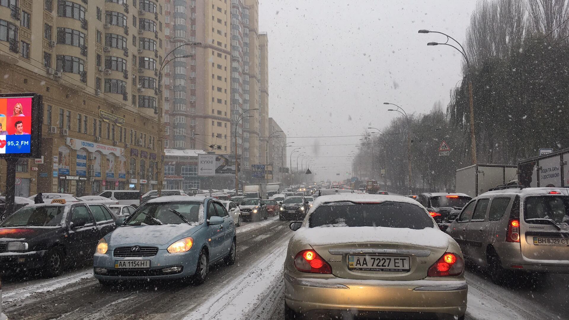 Первый снег вызвал массовые аварии на дорогах Киева и усилил пробки до максимальных 10 баллов