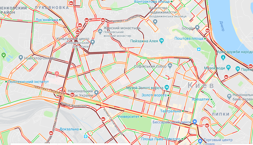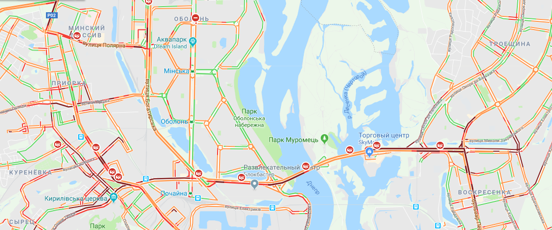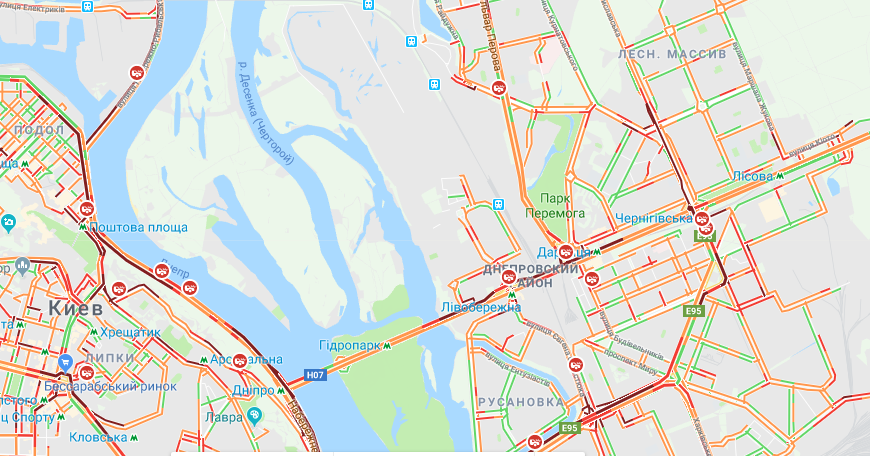 При этом стоит не только центр Киева. На подъездах к городу также наблюдаются тянучки. Аварии, в свою очередь, вызвали скопления автомобилей на улицах Соборной, Демеевской, Гринченко, проспекте Лобановского, Соборности, Бажана, улице Николайчука. Частично стоит Голосеевский проспект. Также автомобилистам стоит объезжать Дарнцицкий, Южный, Гаванский мосты, а также мосты Метро и Патона.