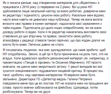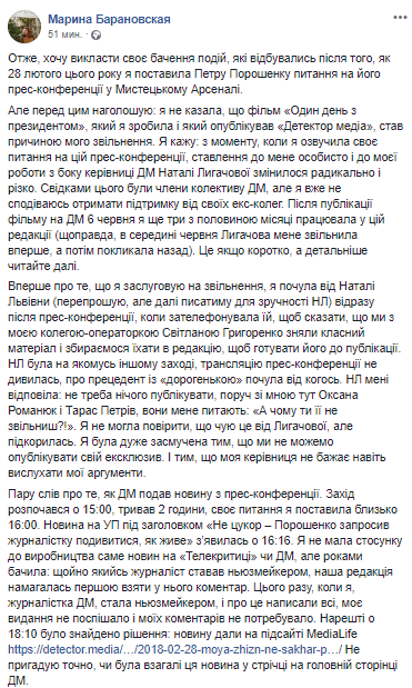 Журналиска Марина Барановская, которая была уволена из издания "Детектор медиа"(ДМ) после того, как задала президенту Петру Порошенко неудобный вопрос, в соцсети изложила свое видение событий, которые развернулись в ее жизни после пресс-конференции главы государства в Художественном Арсенале 28 февраля 2018 года.